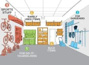 - Wall-mounted hooks and racks for bikes, ladders, and sporting gear